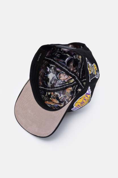 ALLWINS™ x Lakers LA Hat made from 5-Panel Black Polyester with Mauve Suede Underbrim featuring a signature ALLWINS barbwire inside tape and Kobe Bryant's Greatest Moments in silk inside lining.