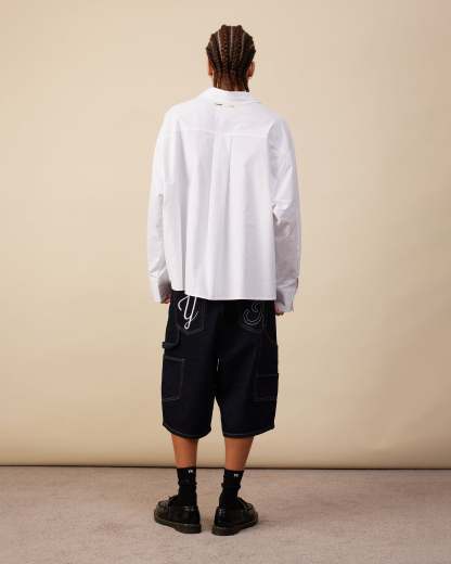 The Double Pocket Longsleeve Shirt is crafted from mid-weight cotton in an oversized, boxy fit. Designed with button detailing along the waistline, it features a double pocket on the left chest with a raised embroidered logo, and a woven patch at the back neck. This product does have an oversized boxy fit, consider sizing down for a more true to size fit.