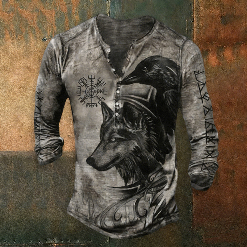 Men's Retro Viking Wolf And Raven Pattern Casual T-shirt