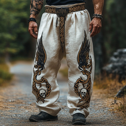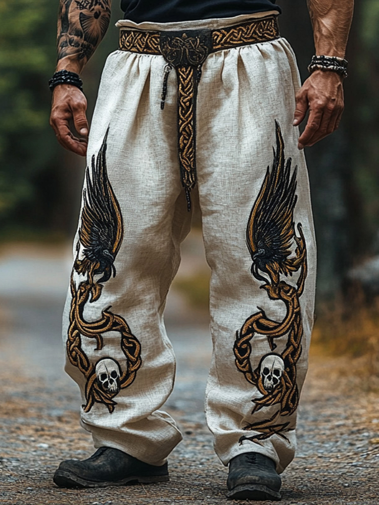 Men's Viking Celtic Raven Skull Pattern Cotton And Linen Casual Pants