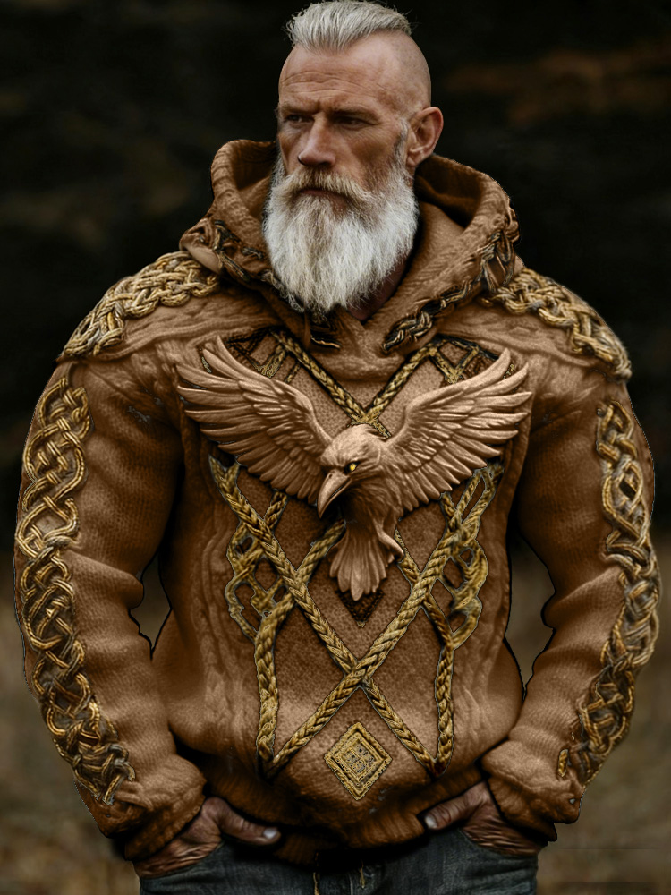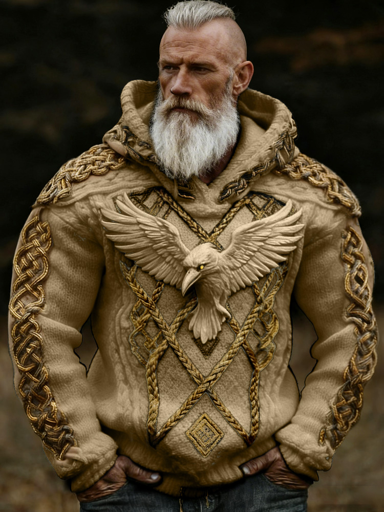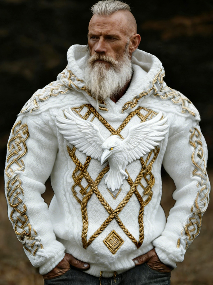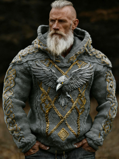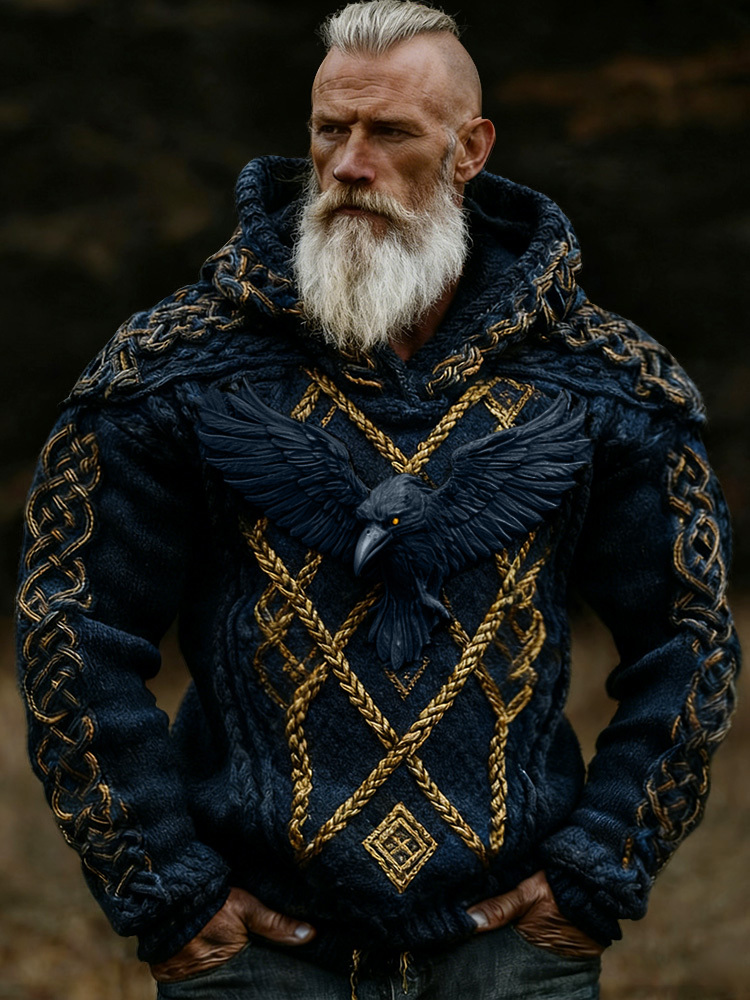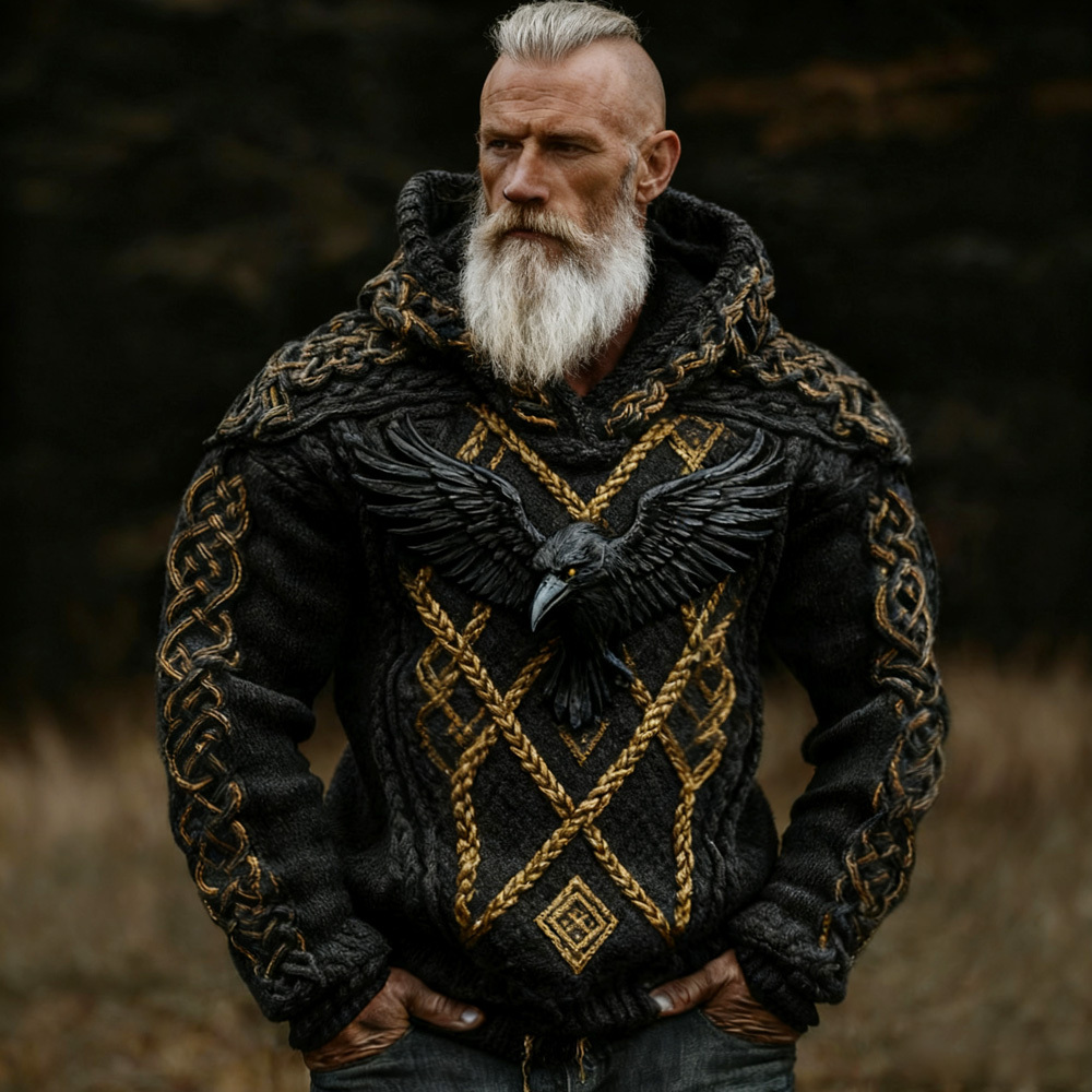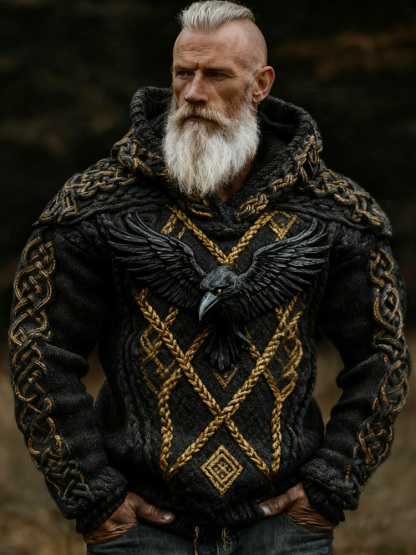 Men's Viking Crow Celtic Knot Jacquard Knitted Hooded Sweater