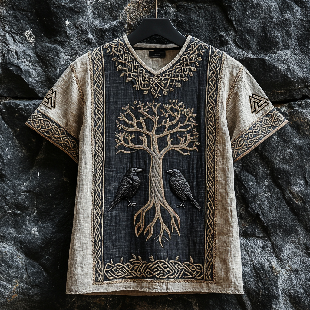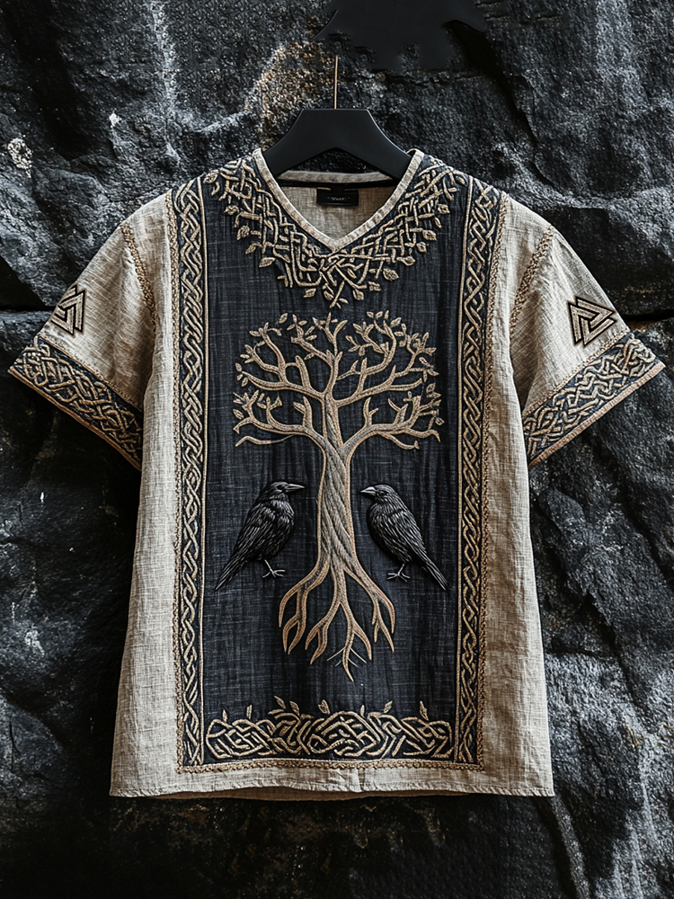 Men's Viking Raven And Tree Of Life Runes Celtic Knot Patchwork Linen T-shirt