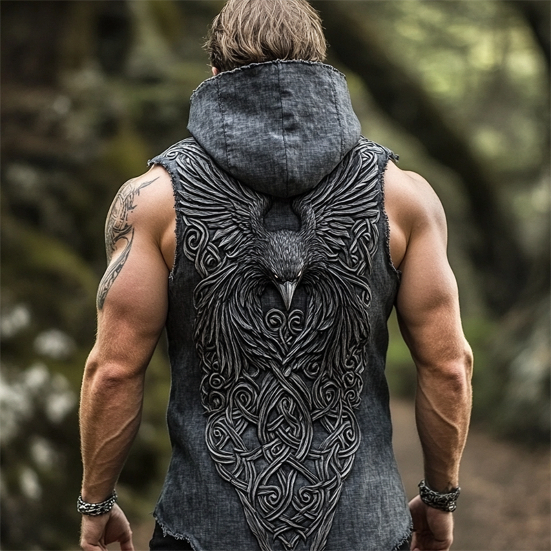 Men's Viking Raven Celtic Art Linen Hooded Vest