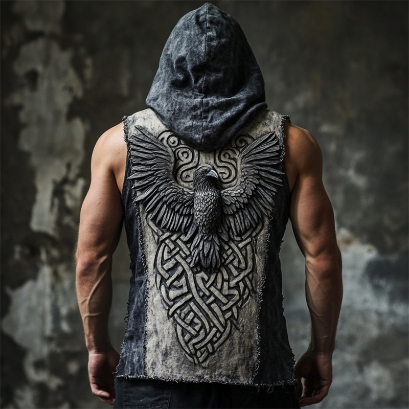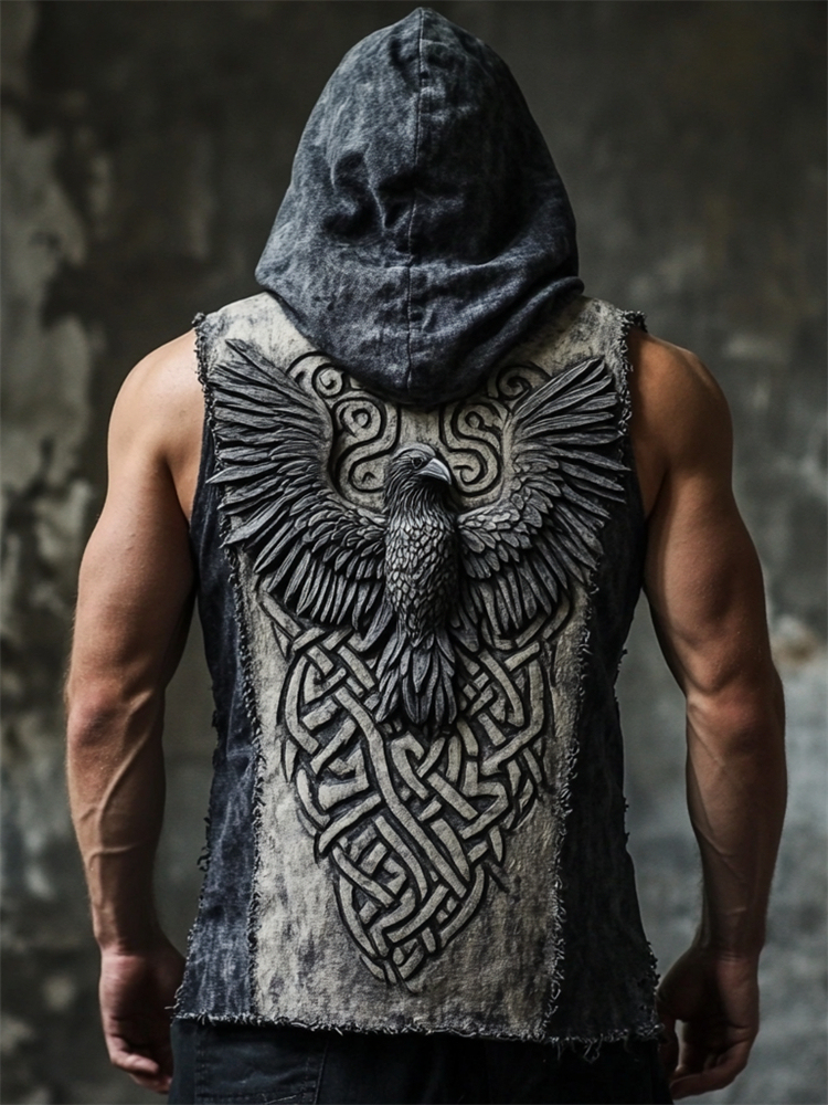Men's Viking Raven Celtic Contrast Patchwork Linen Hooded Vest