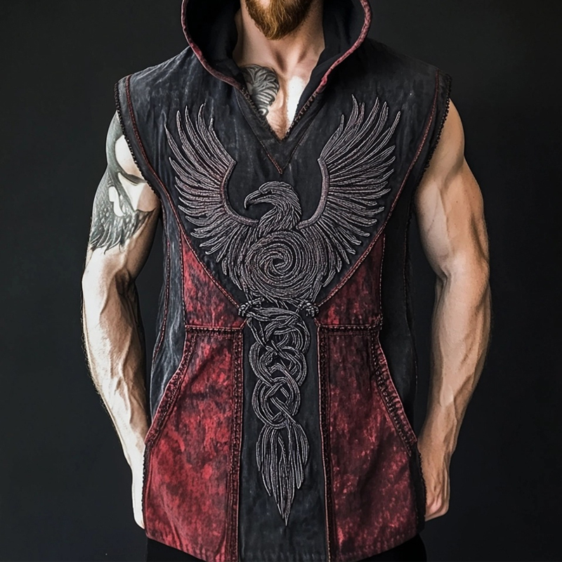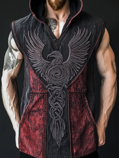 Men's Viking Raven Embroidered Hooded Linen Tank Top