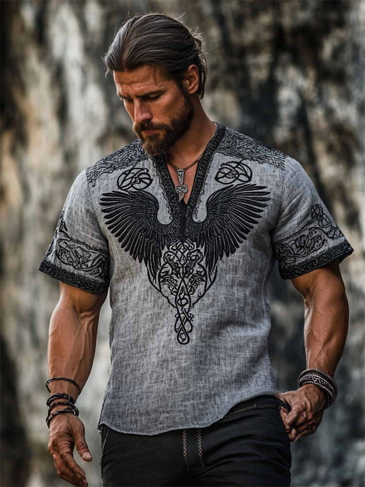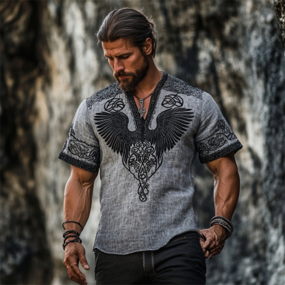 Men's Viking Raven Inspired Celtic Contrast V Neck Linen Shirt