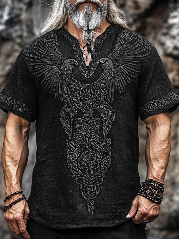 Men's Viking Ravens Celtic Embroidered Washed Linen Shirt