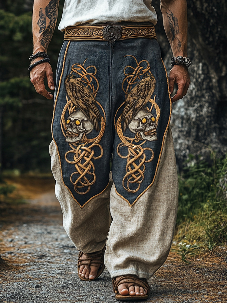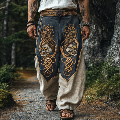Men's Viking Skull Crow Celtic Colorblock Linen Casual Pants