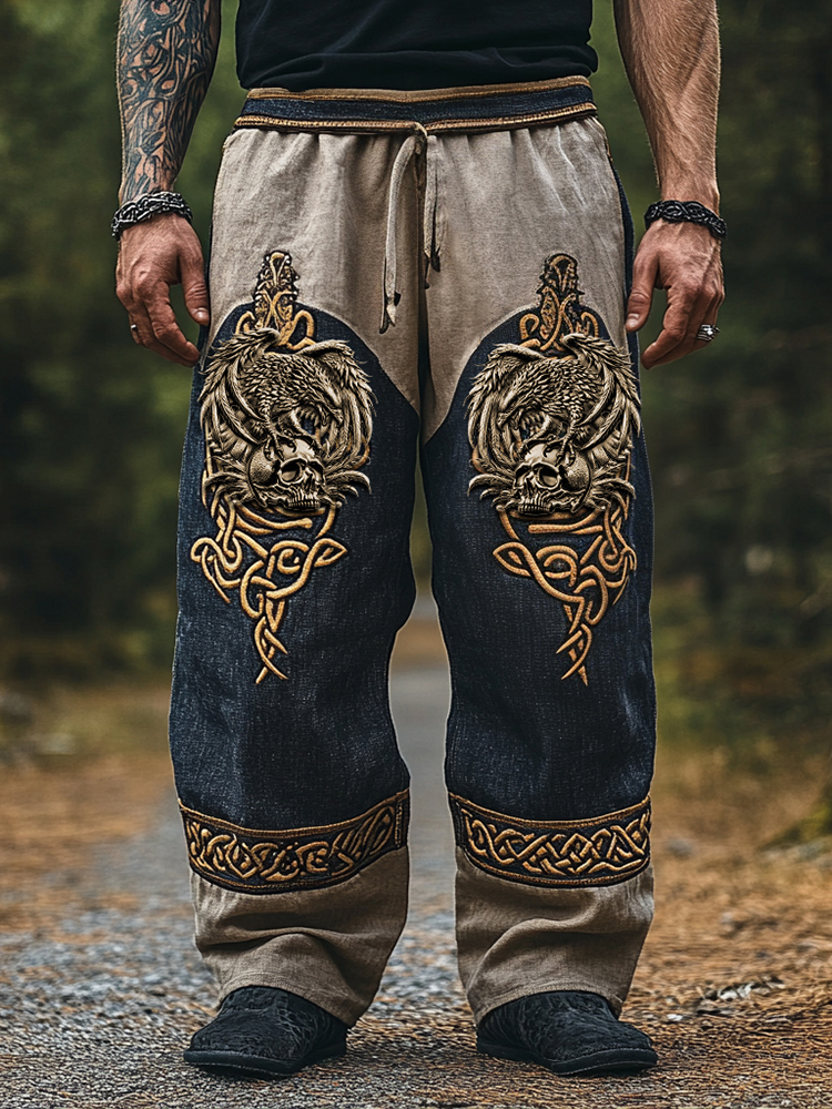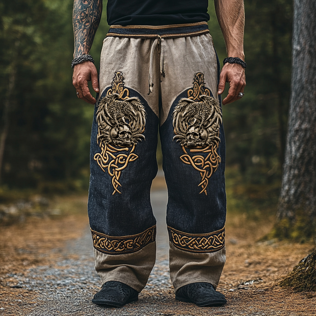 Men's Viking Skull Crow Celtic Pattern Linen Casual Pants