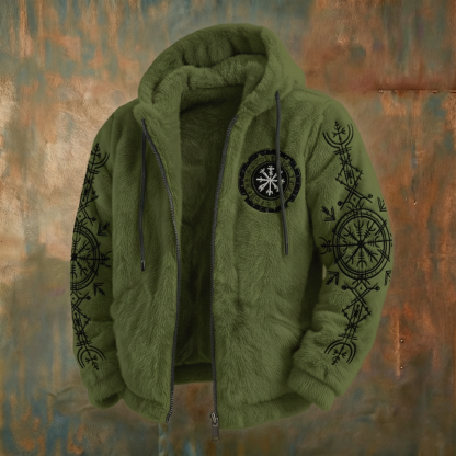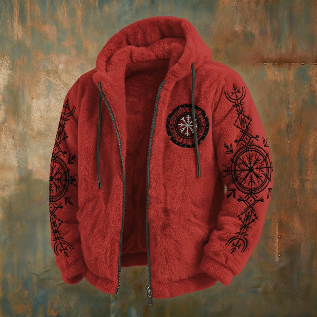 Men's Viking Tribal Jacquard Celtic With Crows & Wolves Inspired Plush Warm Zipped Hooded Jacket