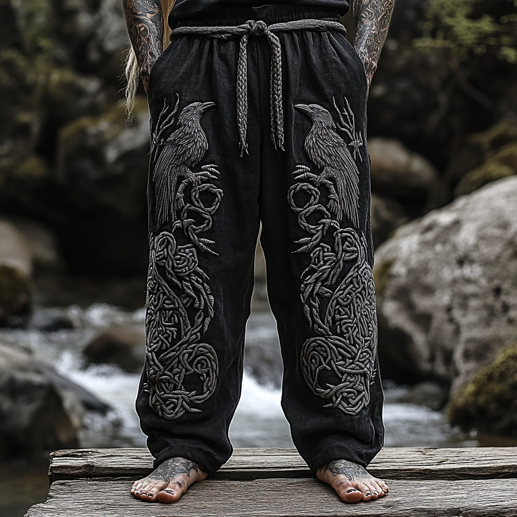 Mens Vintage Viking Crow Celtic Knot Art Linen Blend Pants