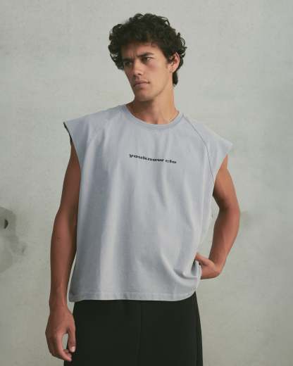 The Oversized Raglan Tank features a relaxed, boxy fit with raglan-style sleeves, a washed finish, a YOUKNOW. logo print on the front, and embroidered star detailing at the back neck.