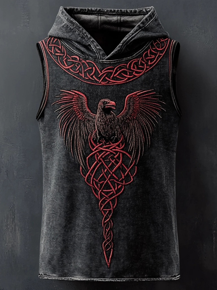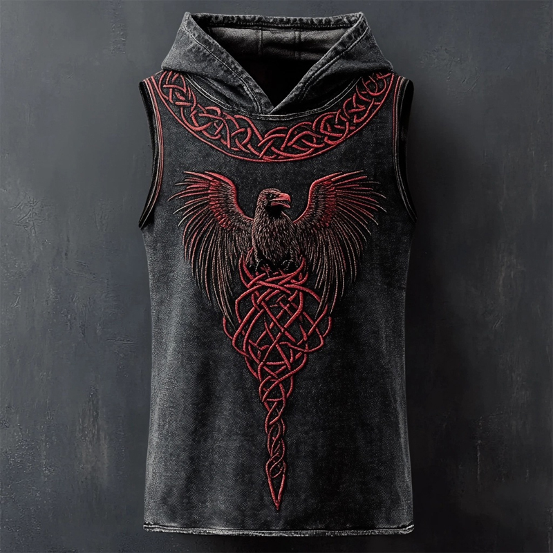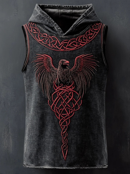 Vintage Viking Celtic Raven Embroidered Hooded Linen Vest