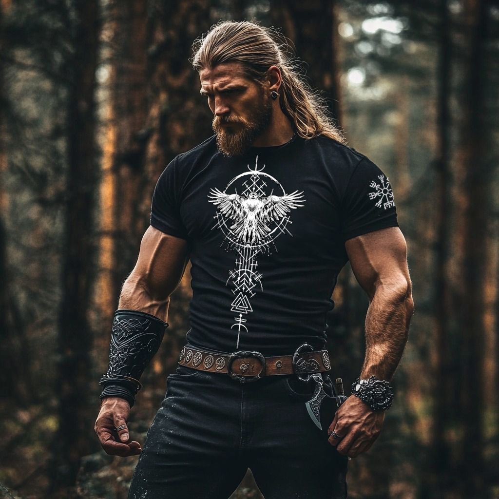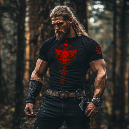 Vintage Viking Raven Rune Print Short Sleeve T-shirt