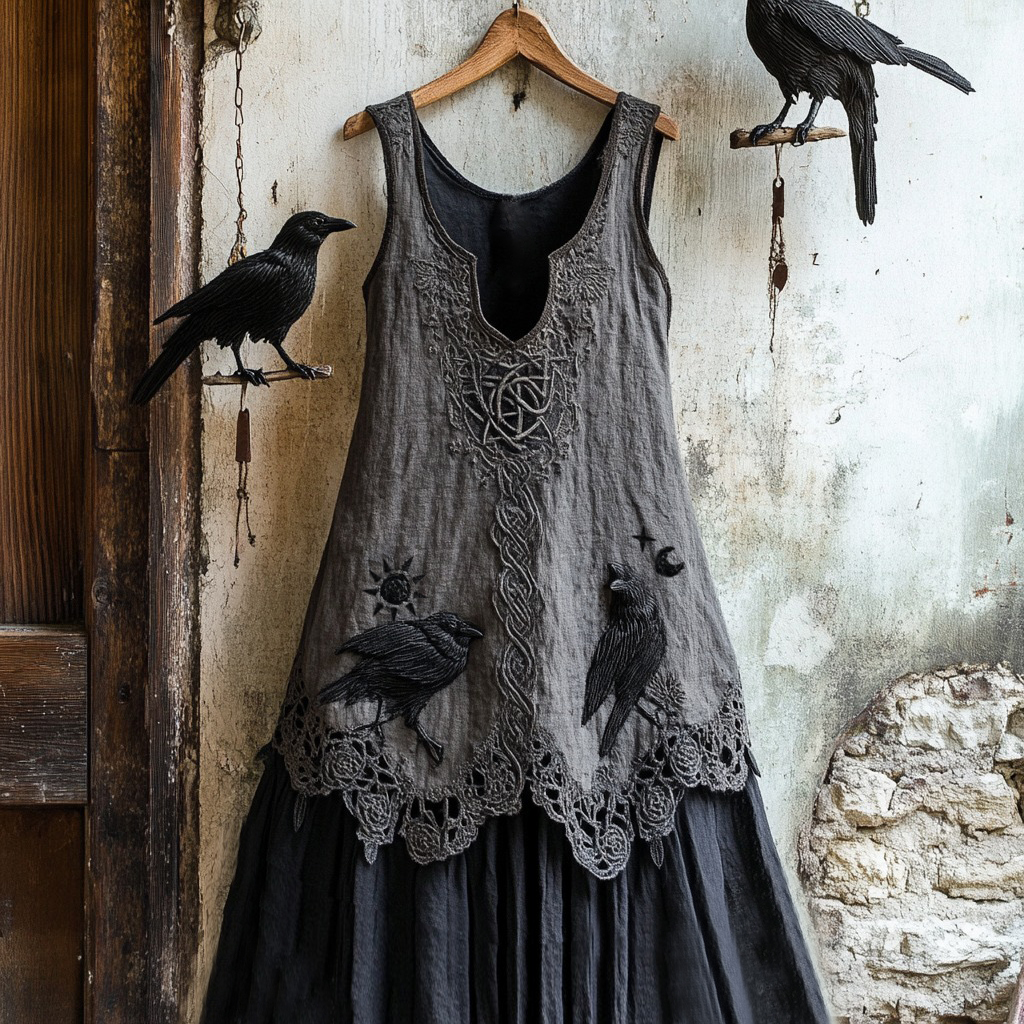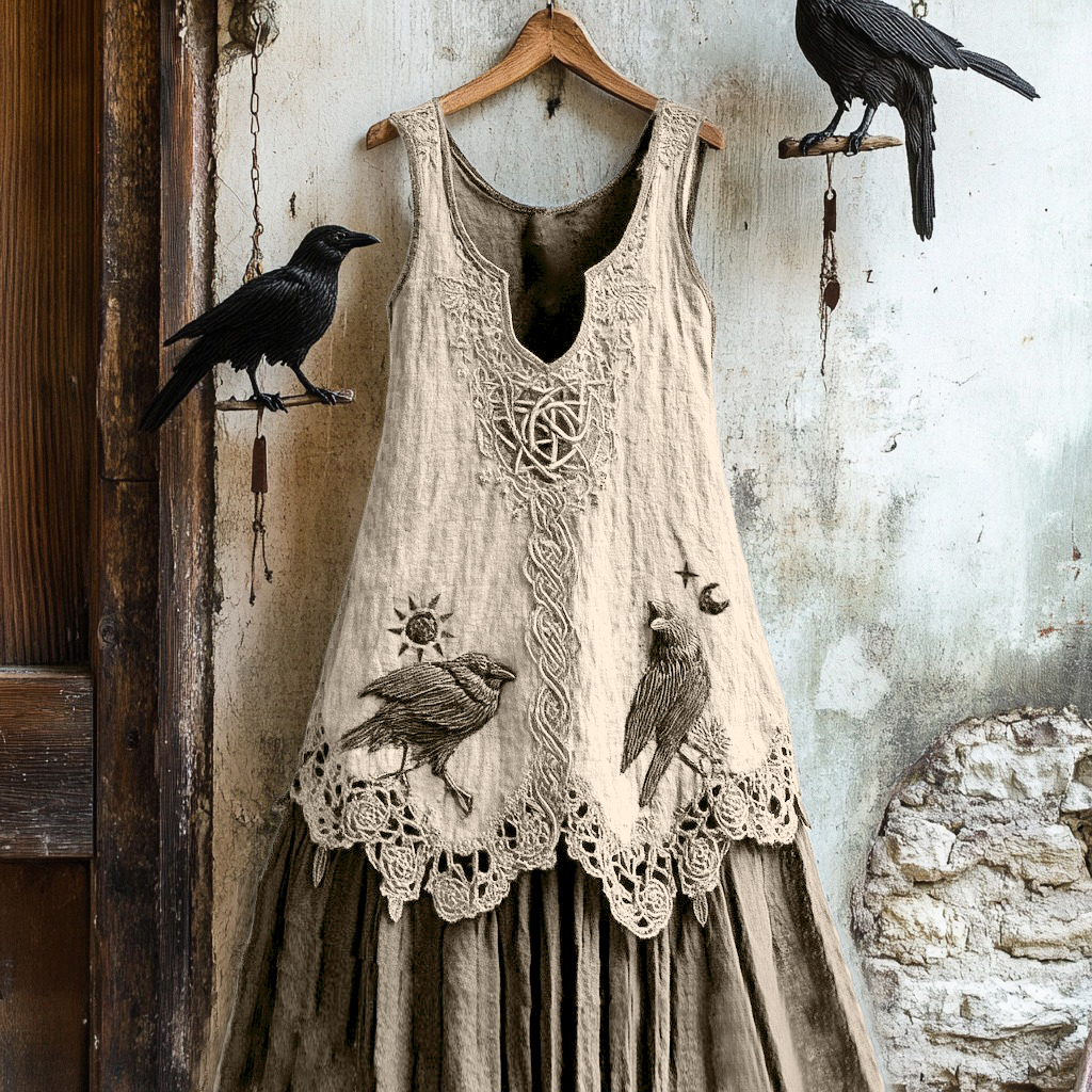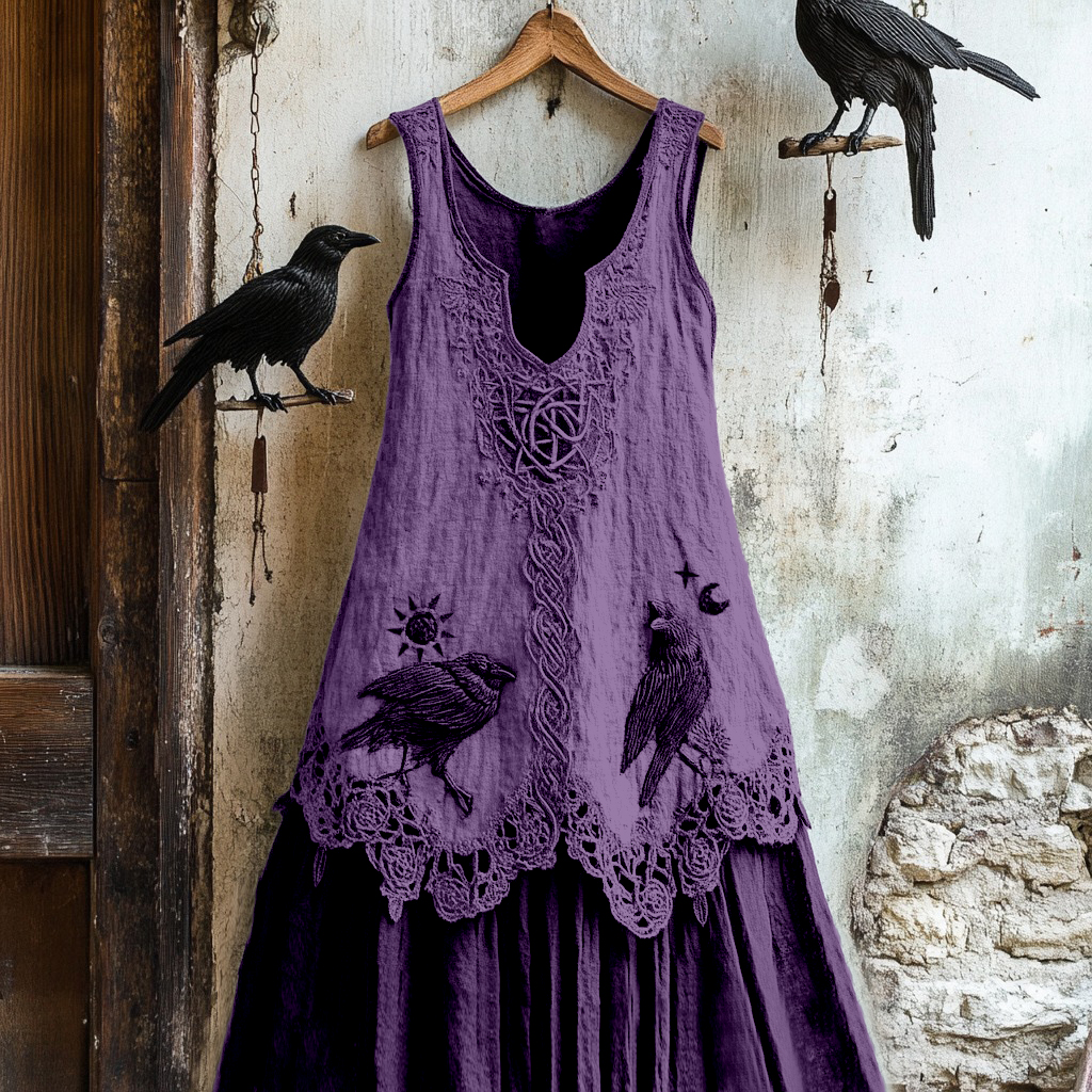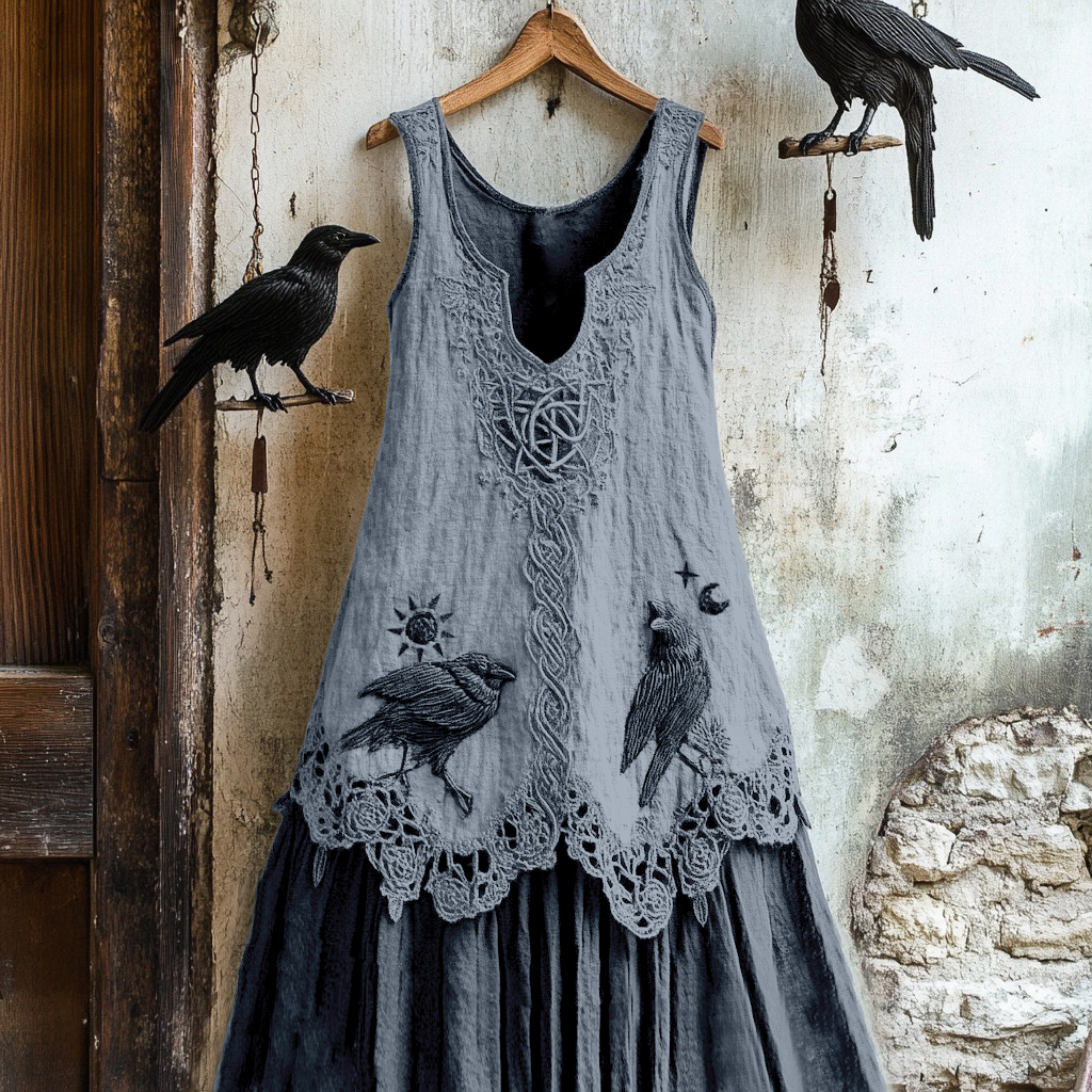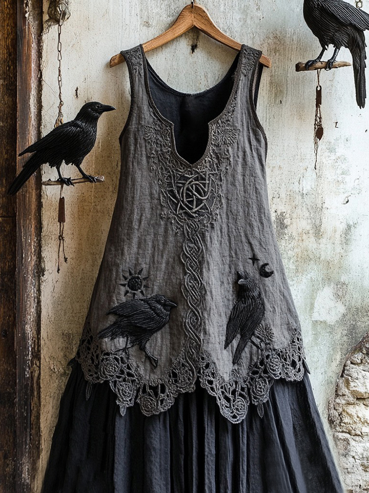 Women's Tribal Raven Embroidery Celtic Lace Art Tank Dress